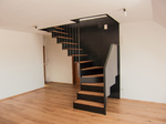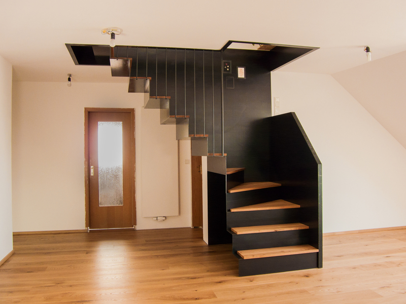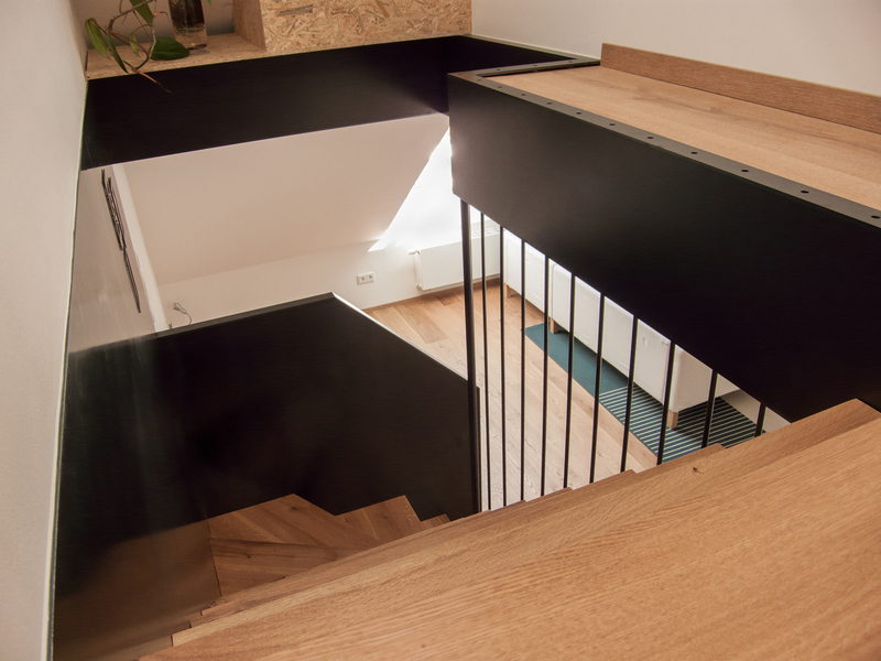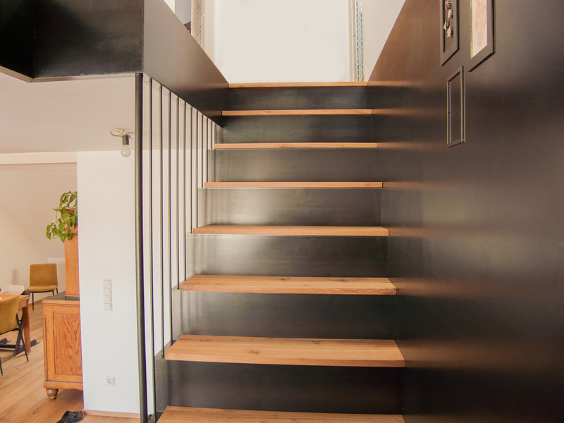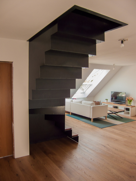 Treffender könnte die Beschreibung der Treppe nicht sein, die für eine zweigeschossige Dachgeschosswohnung in einem Privathaus gestaltet und um-gesetzt wurde. Da sie sich innerhalb des Wohnraumes
