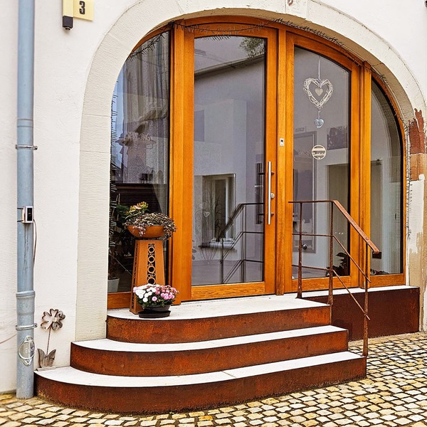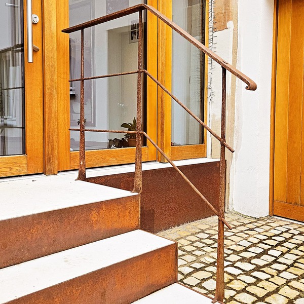 Die Oberfläche ist verzinkt, geschwärzt und gewachst. Sie erzeugt eine Zugehörigkeit der im Hauseingangsbereich verwendeten Materialien zueinander und schafft somit eine große Harmonie der in Ihrem Sinn jeweils unterschiedlichen Objekte.