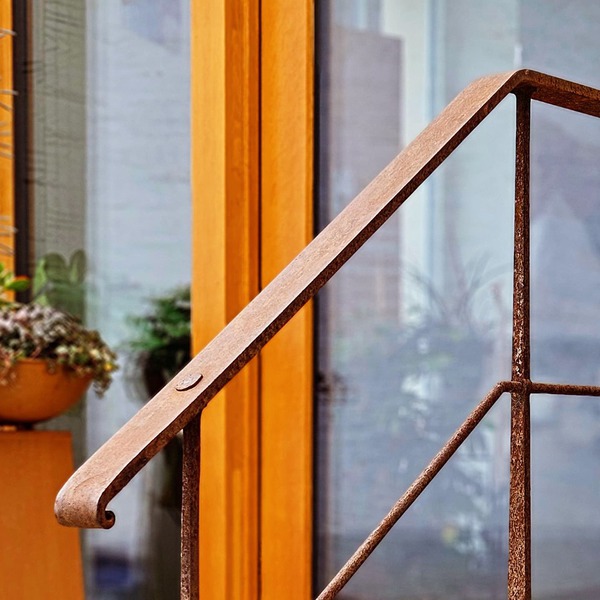 Diese Bedürfnisse der Menschen am Ort decken sich mit meiner Wahrnehmung der örtlichen Architektur. Der Handlauf folgt ganz klar und einfach der Treppenlauflinie und ist somit sehr selbstverständlich in den architektonischen Raum integriert. Durch den logisch der Form folgenden Richtungswechsel vom Greifelement in das Pfostenelement besteht er dennoch als eigenständiges Element.